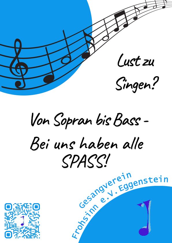 Das Logo unseres Vereins bleibt die blaue Note, ergänzt durch den entsprechend erzeugten QR - Code unserer Vereinsadresse. Versucht es, versuchen Sie es, im Chor können viele nette Zeitgenossen angetroffen, viele schöne Lieder gesungen, auf der Webseite (www.gv-frohsinn-1838.de) in viele interessanten Informationen gestöbert werden.
